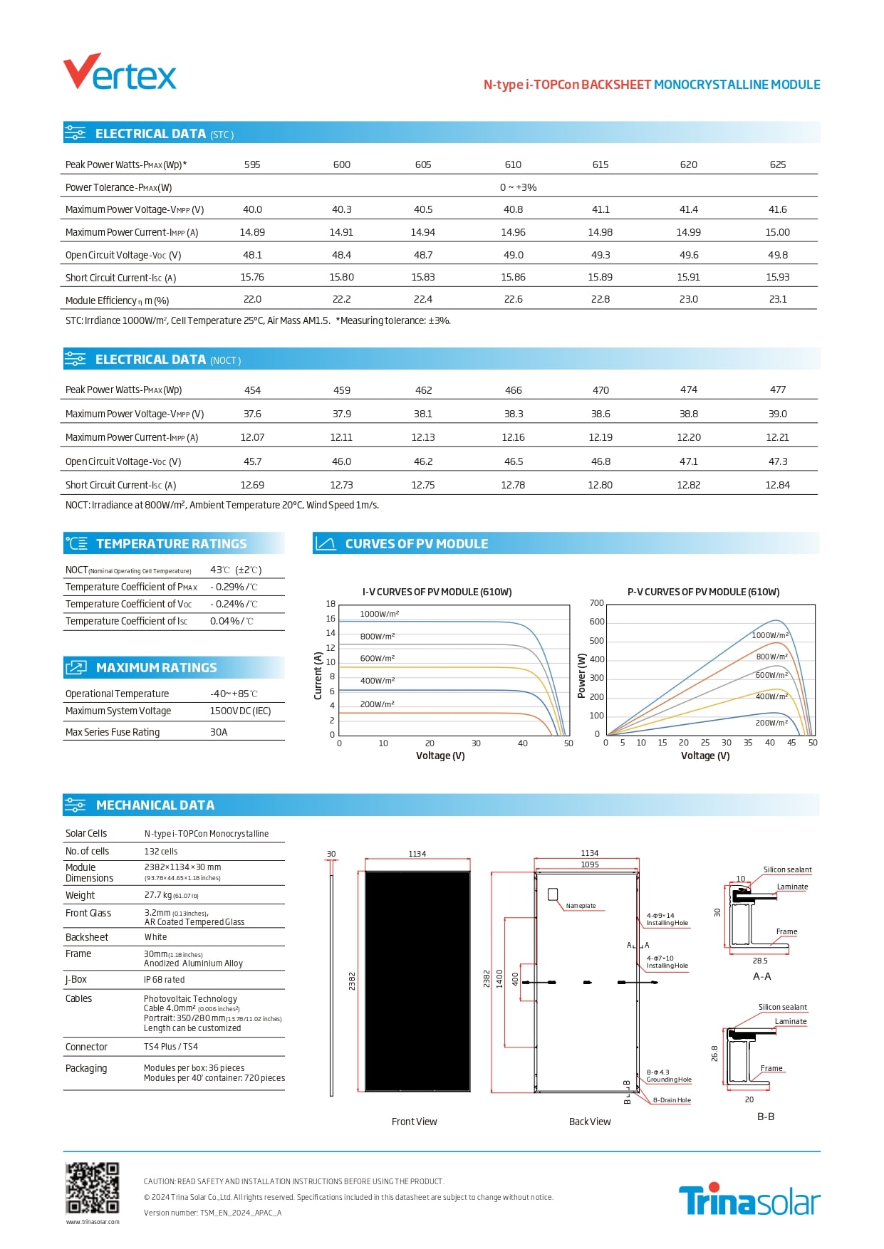 Daya Tinggi: Dengan kapasitas 620 W, Panel Surya Trina Vertex Anti-Dust Backsheet Monocrystalline Module menawarkan daya yang tinggi per unit area, memaksimalkan potensi energi yang dihasilkan dari setiap meter persegi panel.