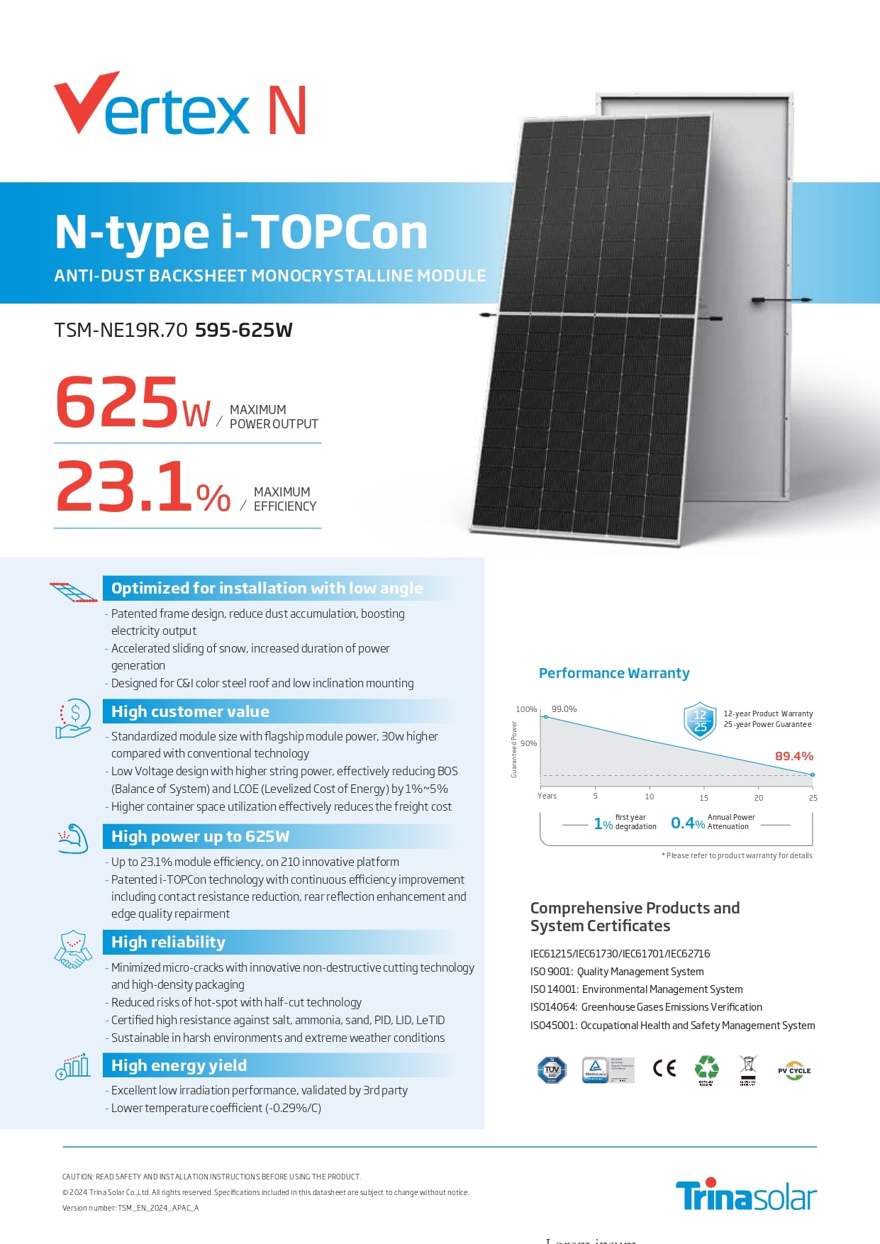 Daya Tinggi: Dengan kapasitas 620 W, Panel Surya Trina Vertex Anti-Dust Backsheet Monocrystalline Module menawarkan daya yang tinggi per unit area, memaksimalkan potensi energi yang dihasilkan dari setiap meter persegi panel.